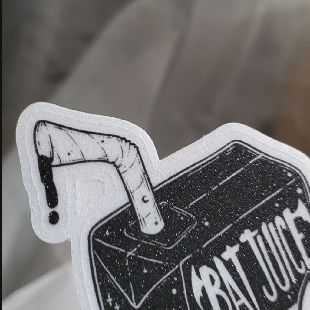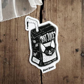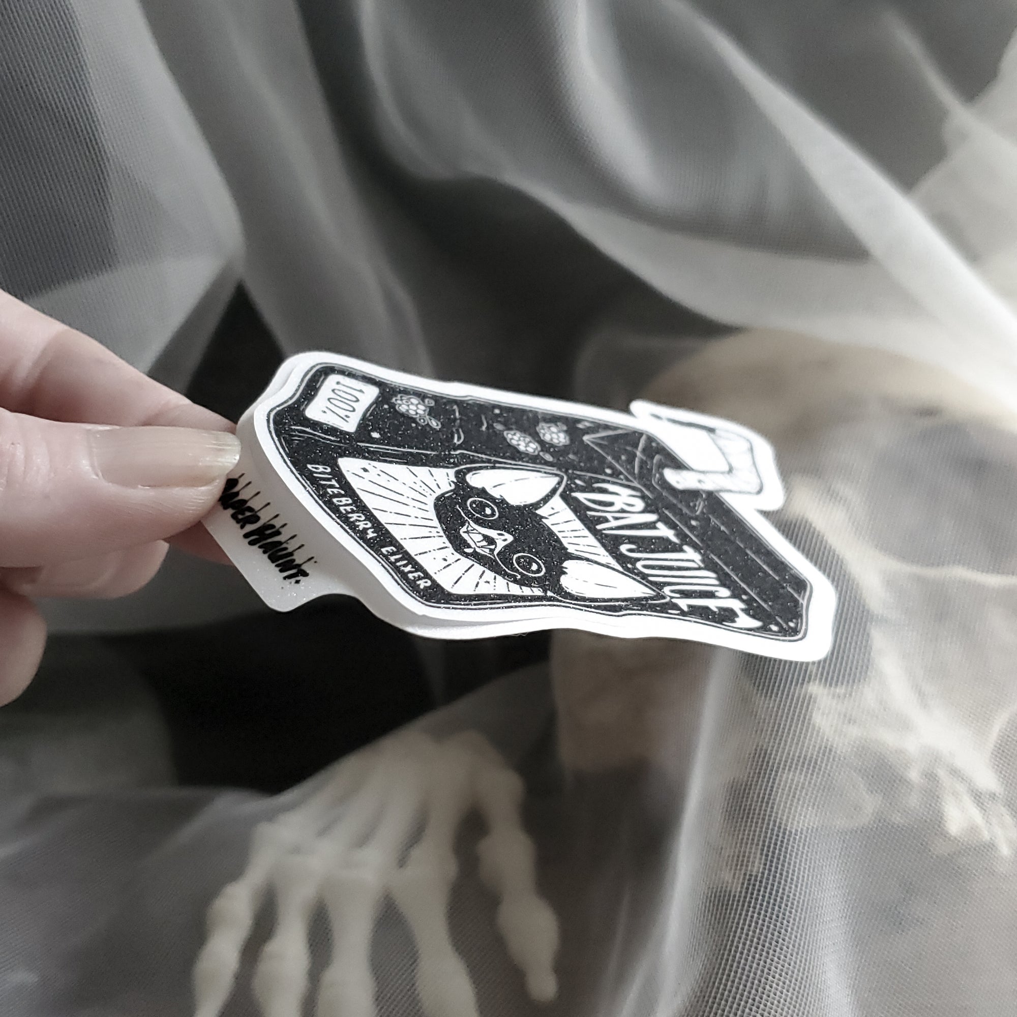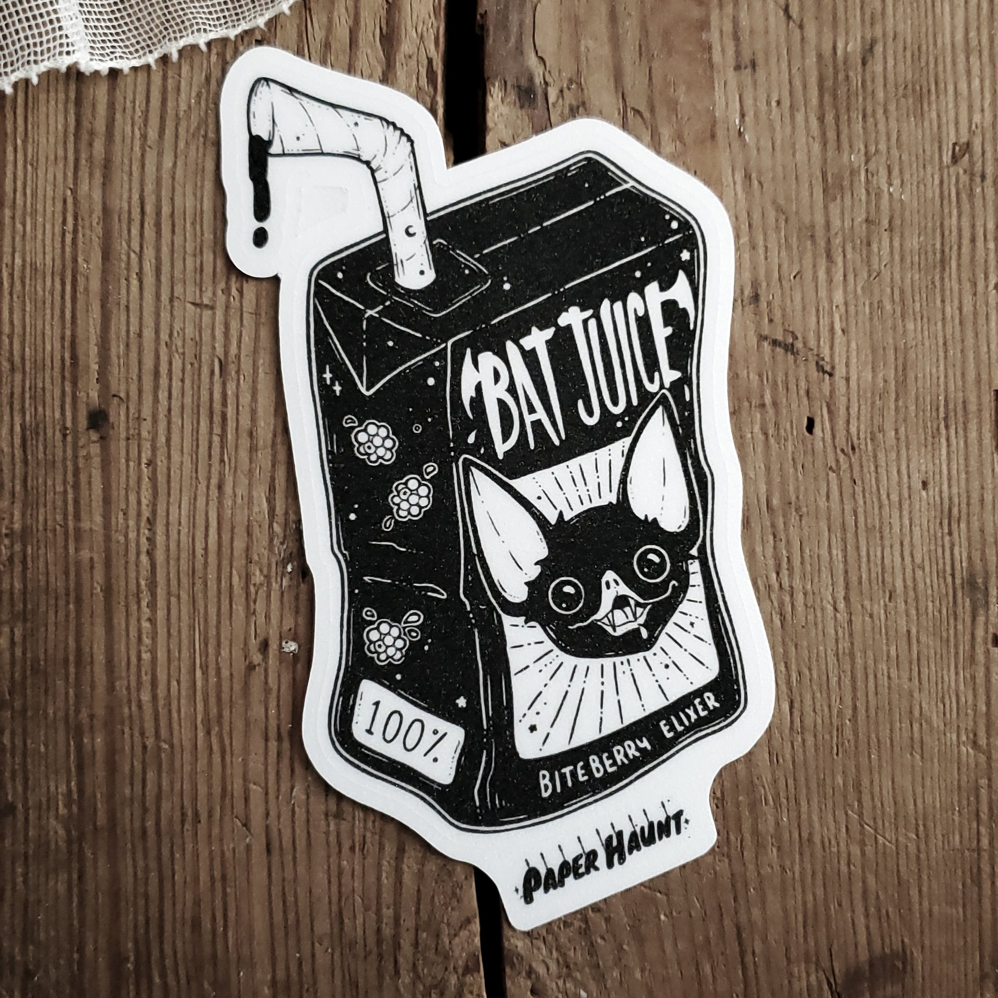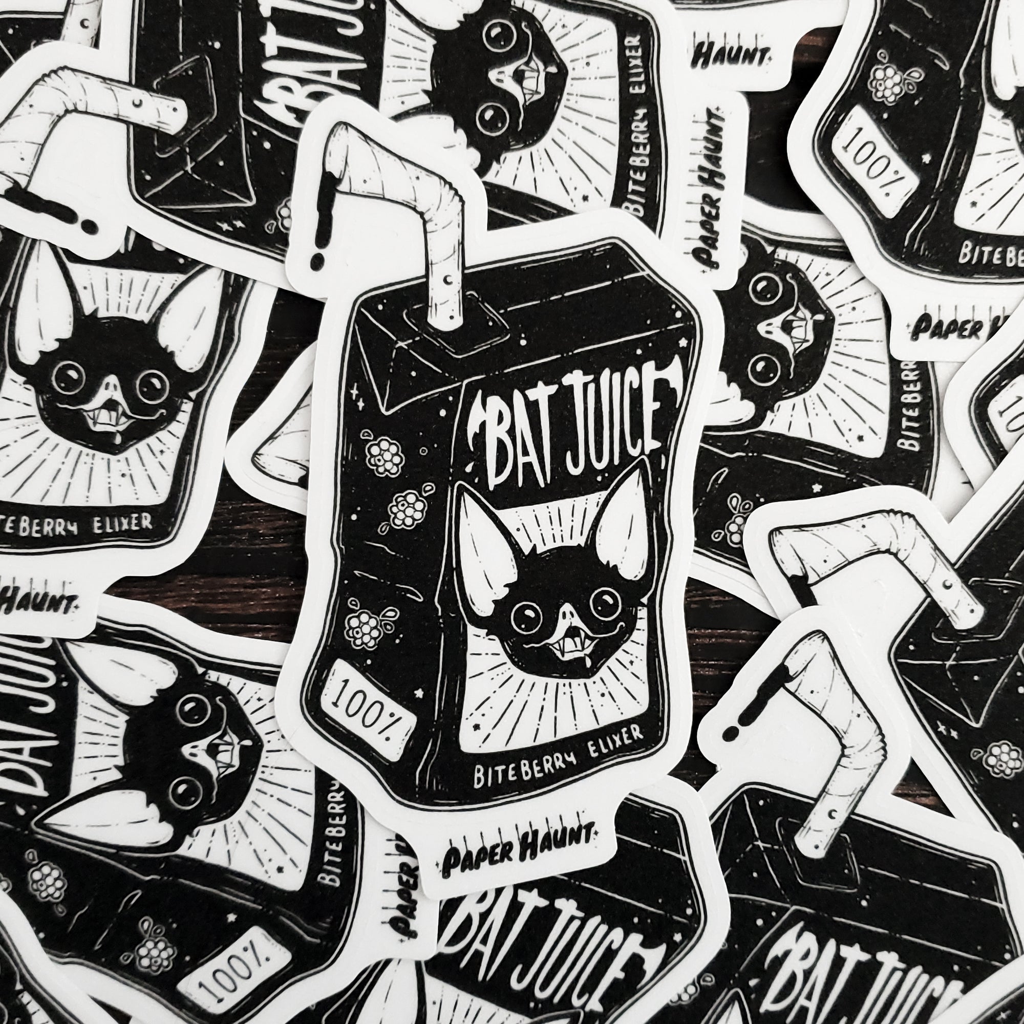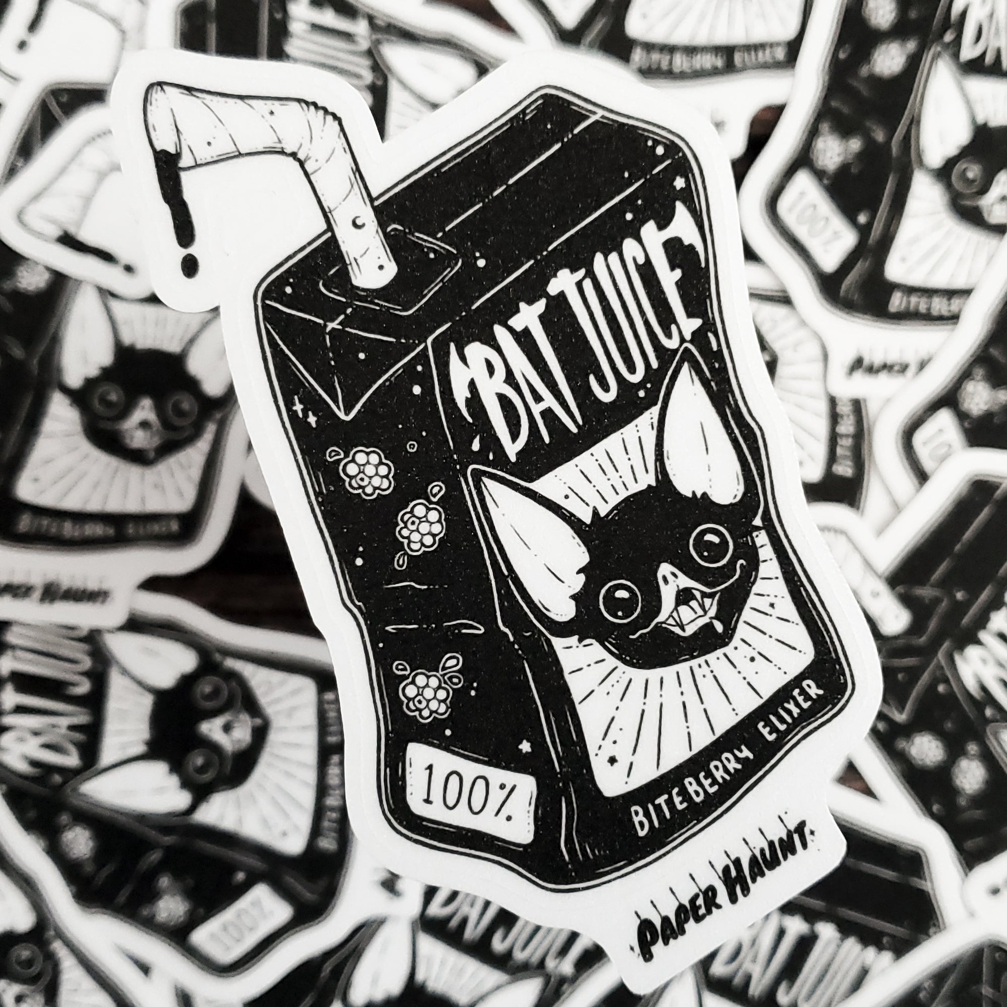 Haunt your laptop, journal or crypt with the new and improved creepy cute bat juice sticker in black and white. Sticker Features an adorable vampire bat. Spooky cute pastel goth adornment with an easy peel backing, perfect gift for Halloween and vampire. Logo is not part of sticker but the backing.