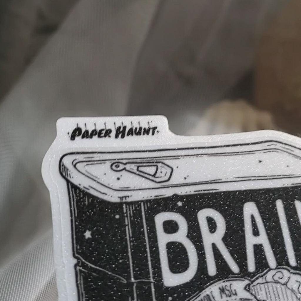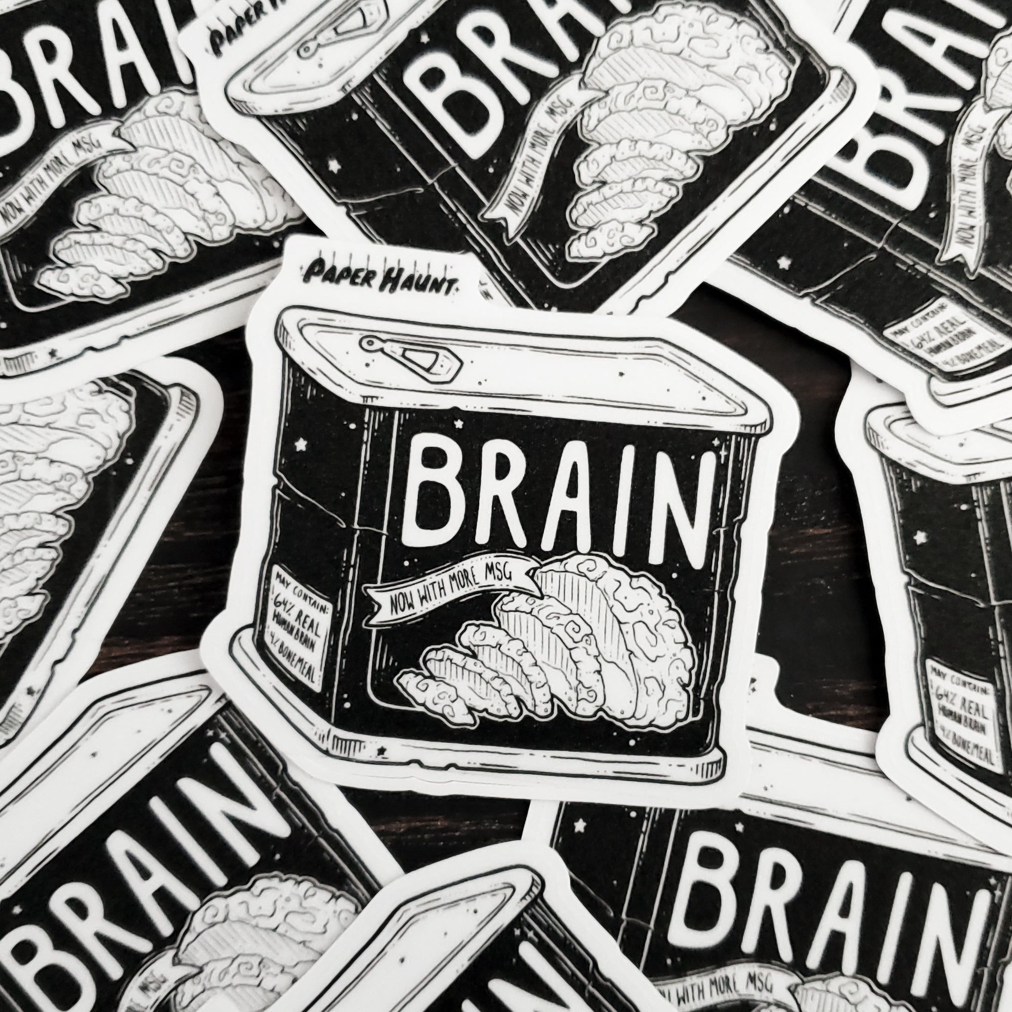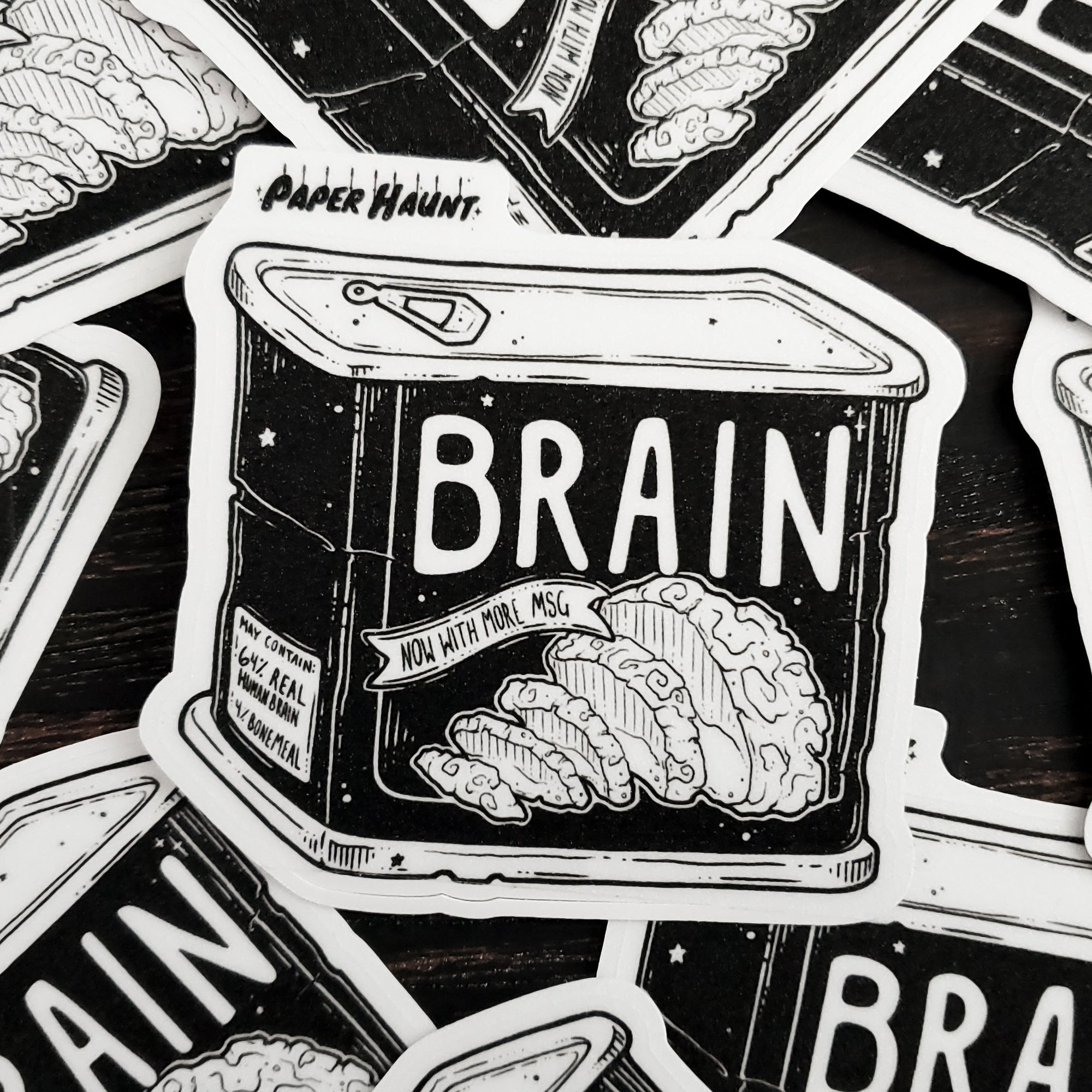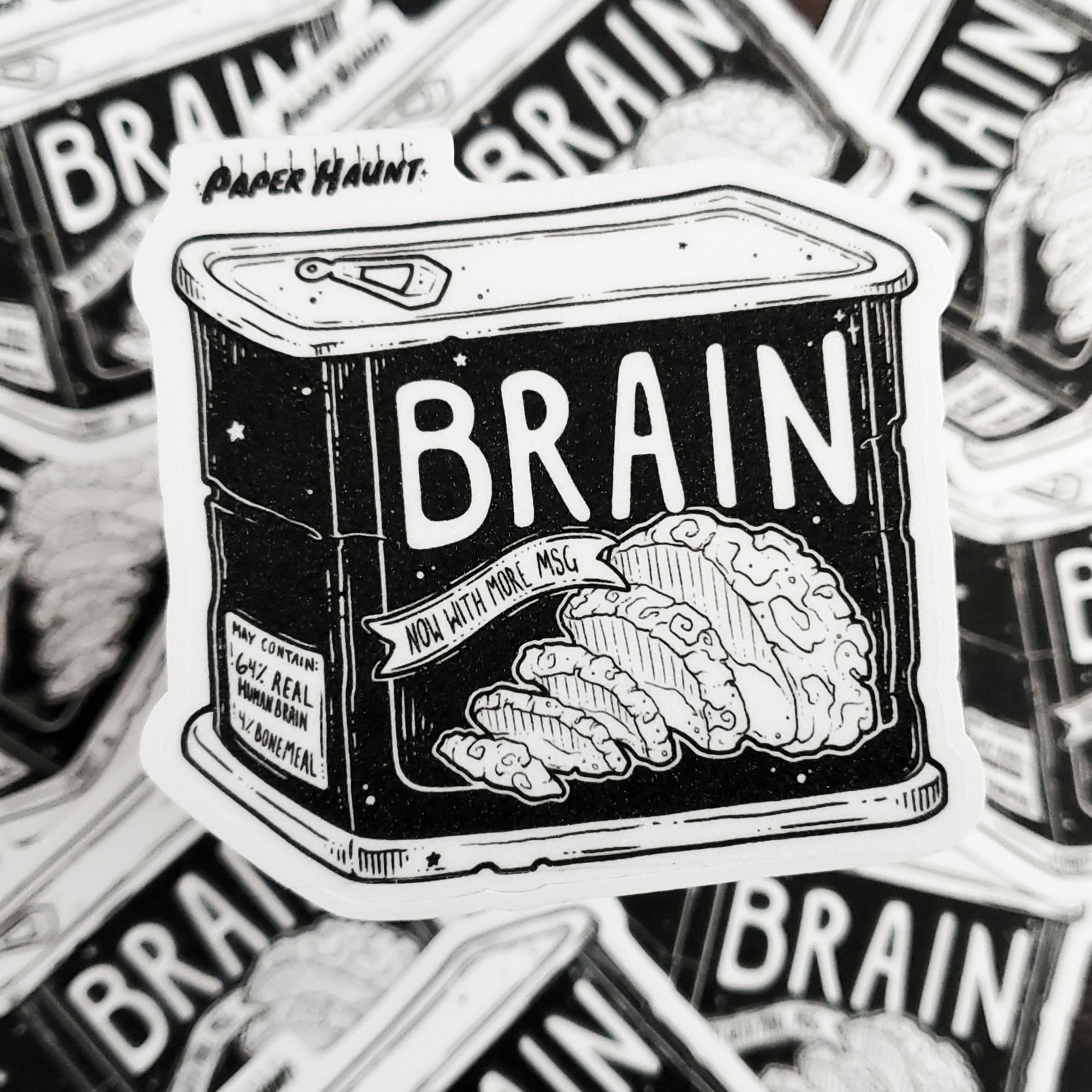 Haunt your laptop, journal or crypt Brain tin can sticker in black and white, part of the Zombie Foods collection, by artist, White stag. Creepy cute sticker inspired by a common shelf stable processed meat, Spam.