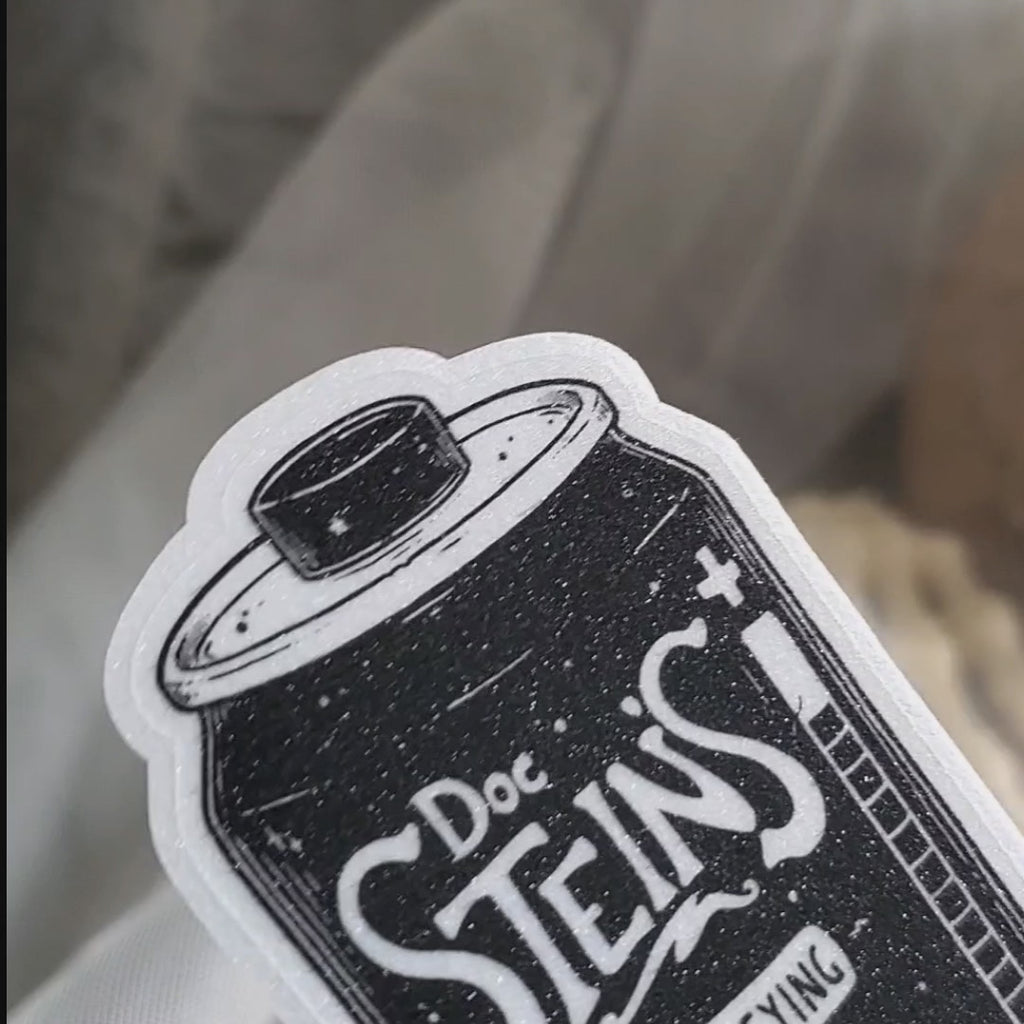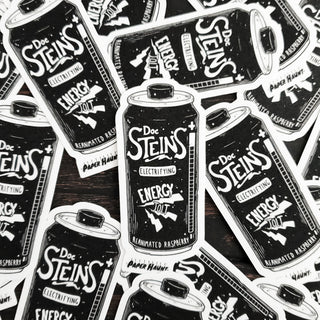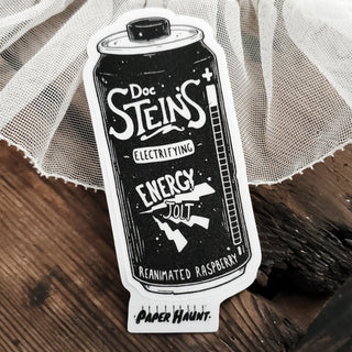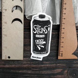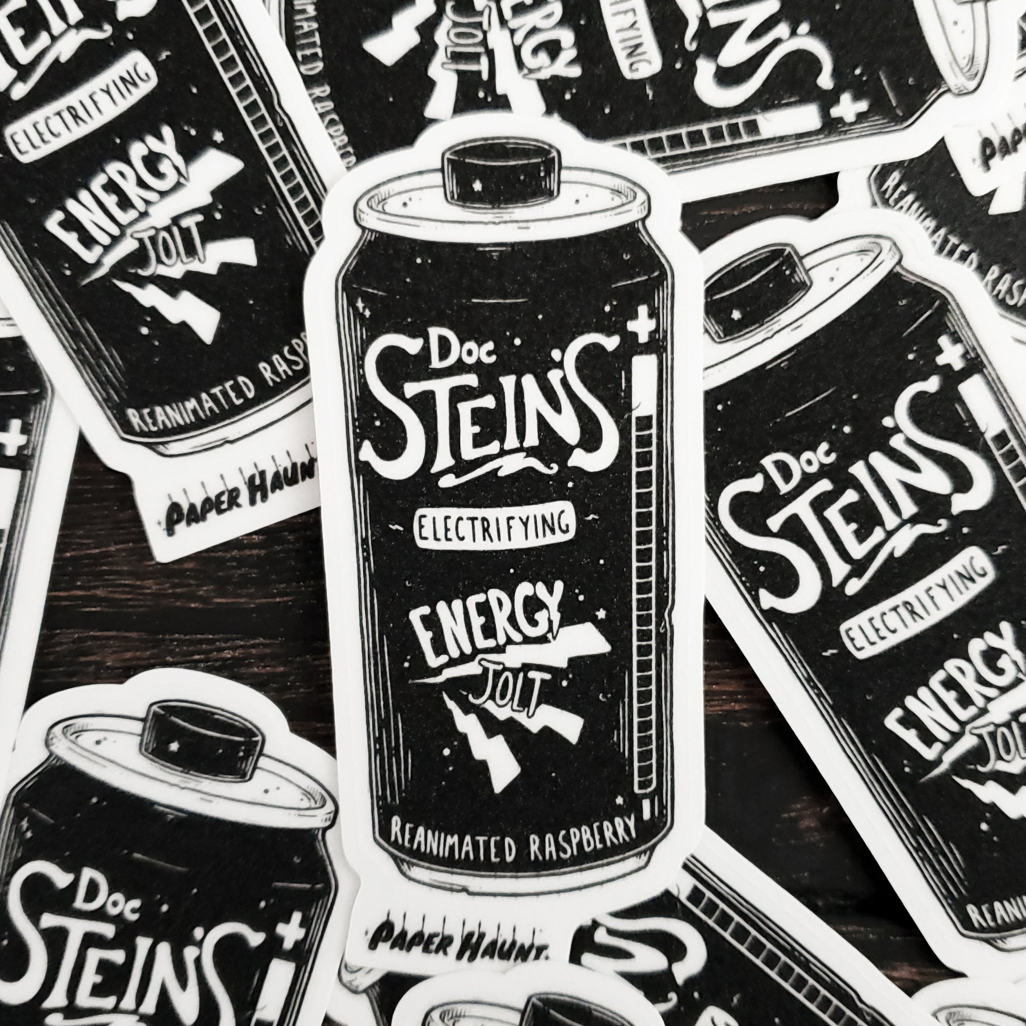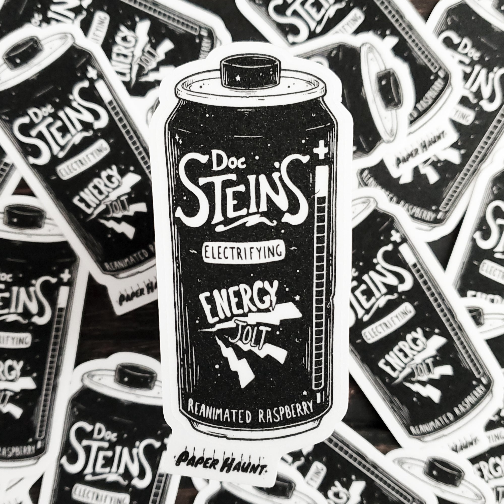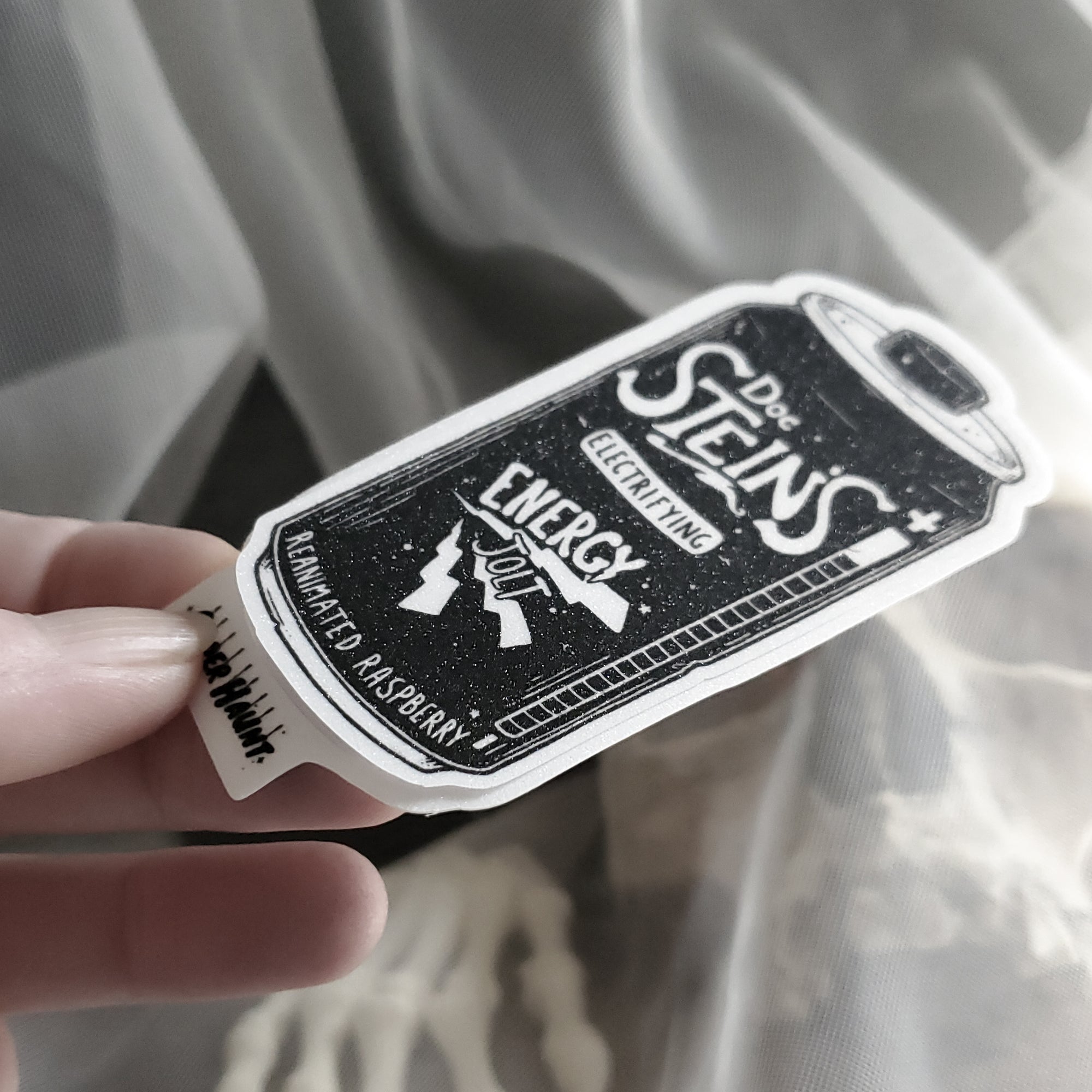 Frankenstein themed, Doc Stein's Electrifying Energy jolt soda/energy drink can sticker in black and white. Haunt your laptop, journal or crypt with this creepy cute Frankenstein sticker. Spooky cute goth adornment with an easy peel backing, perfect gift for Halloween and spooky book lovers. Logo is not part of sticker but the backing.