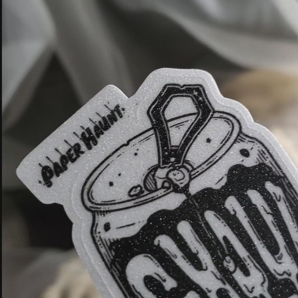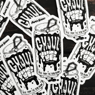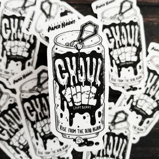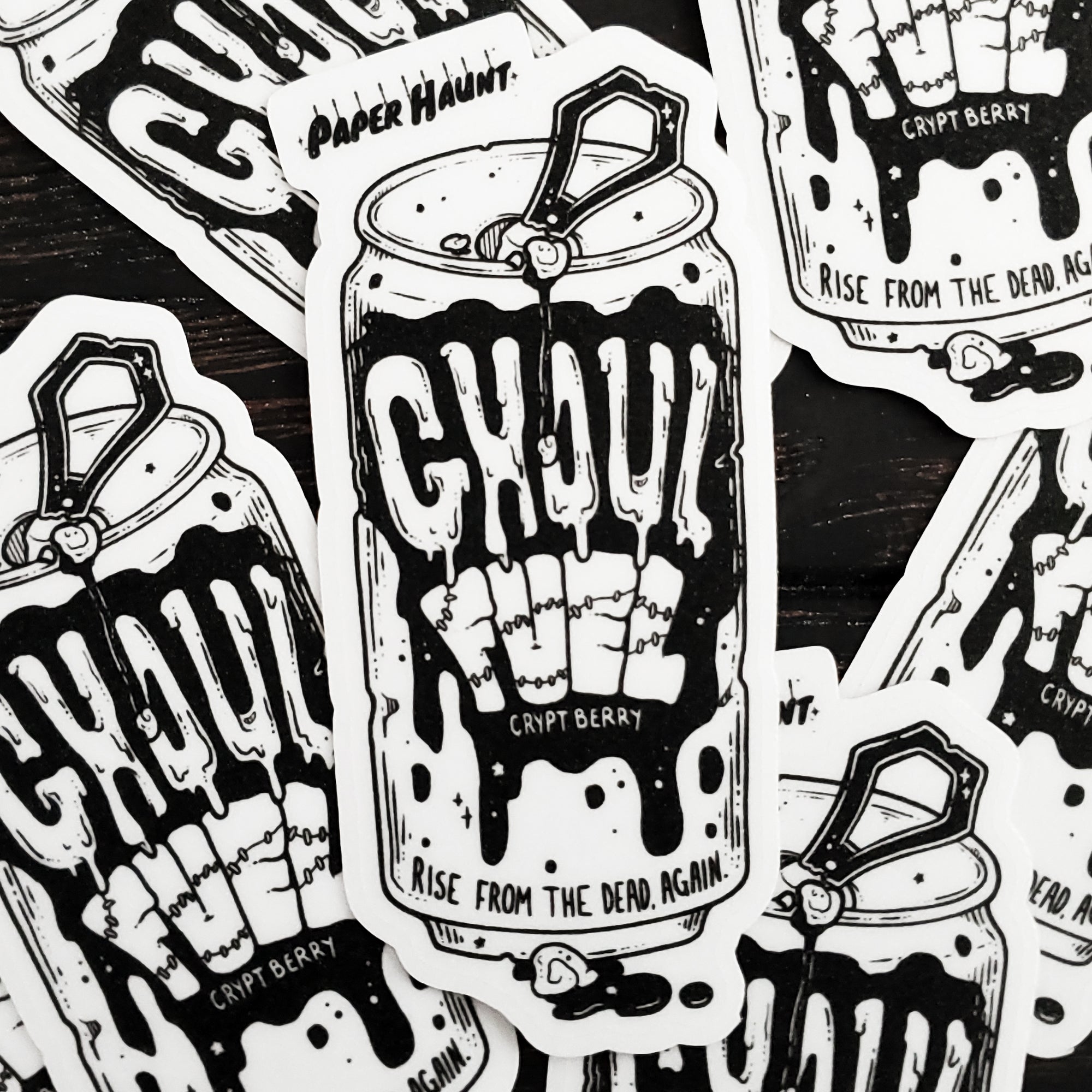Haunt your laptop, journal or crypt with Ghoul Fuel zombie-themed soda can in black and white sticker by Artist, White Stag.
