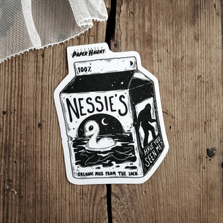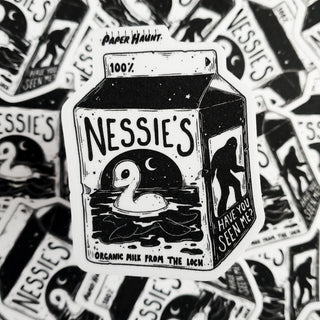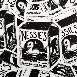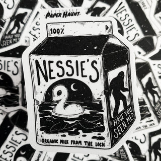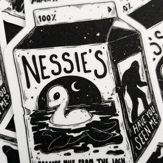 Haunt your laptop, journal or crypt with this creepy cute Loch ness cryptid themed milk carton sticker also featuring big foot in black and white.
