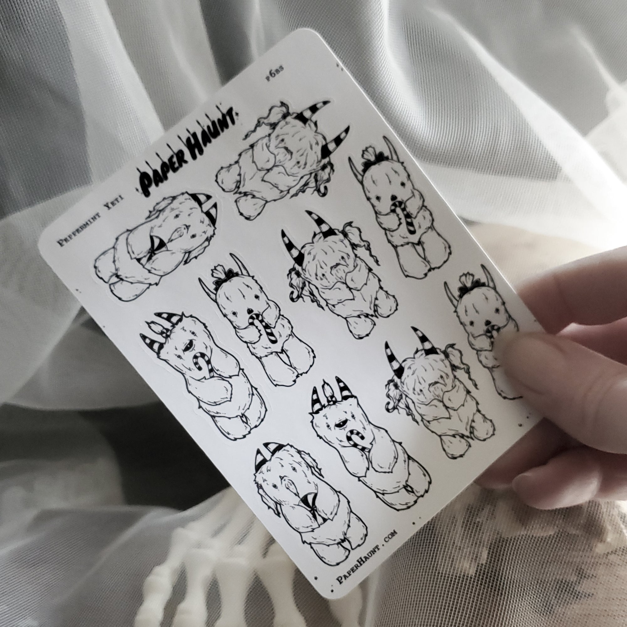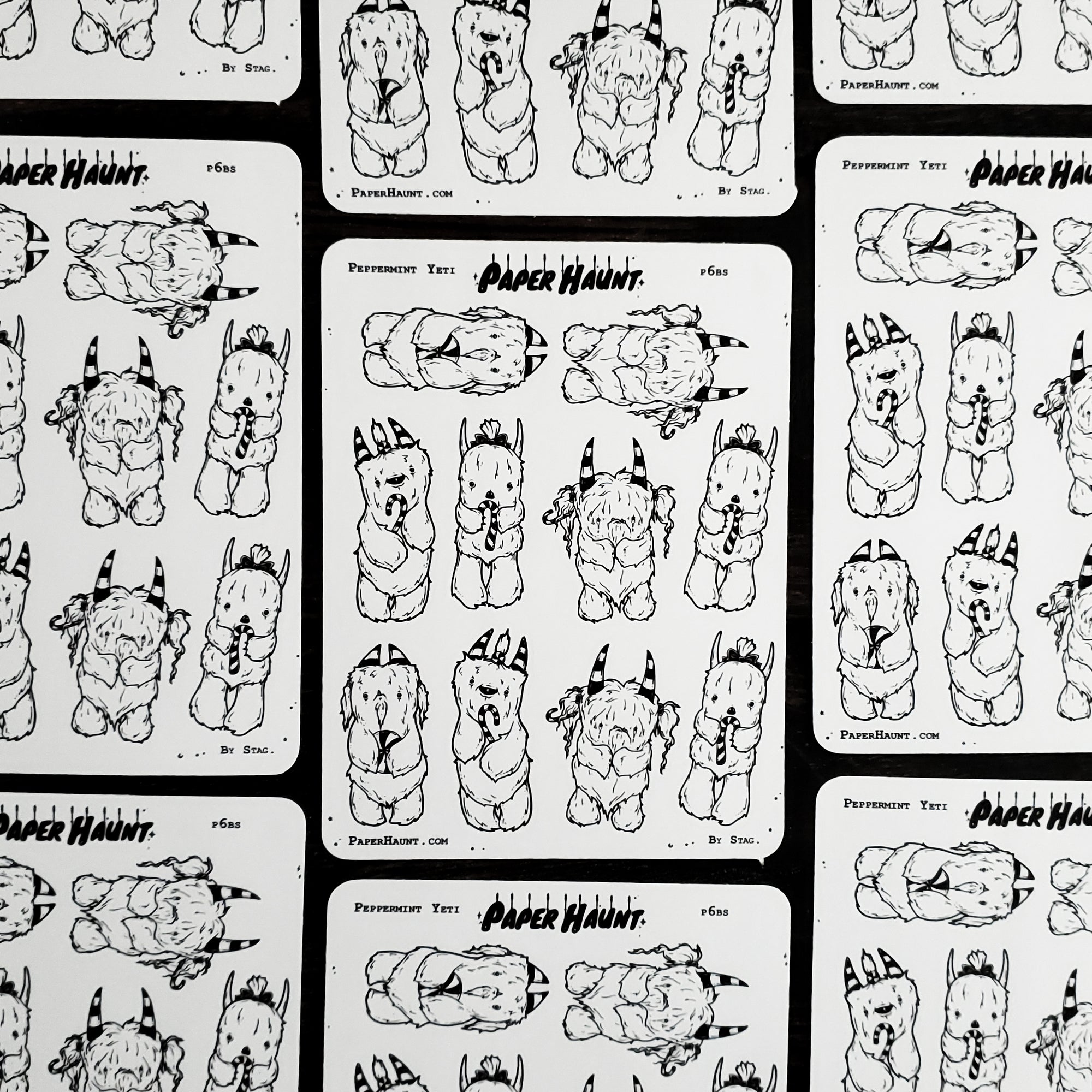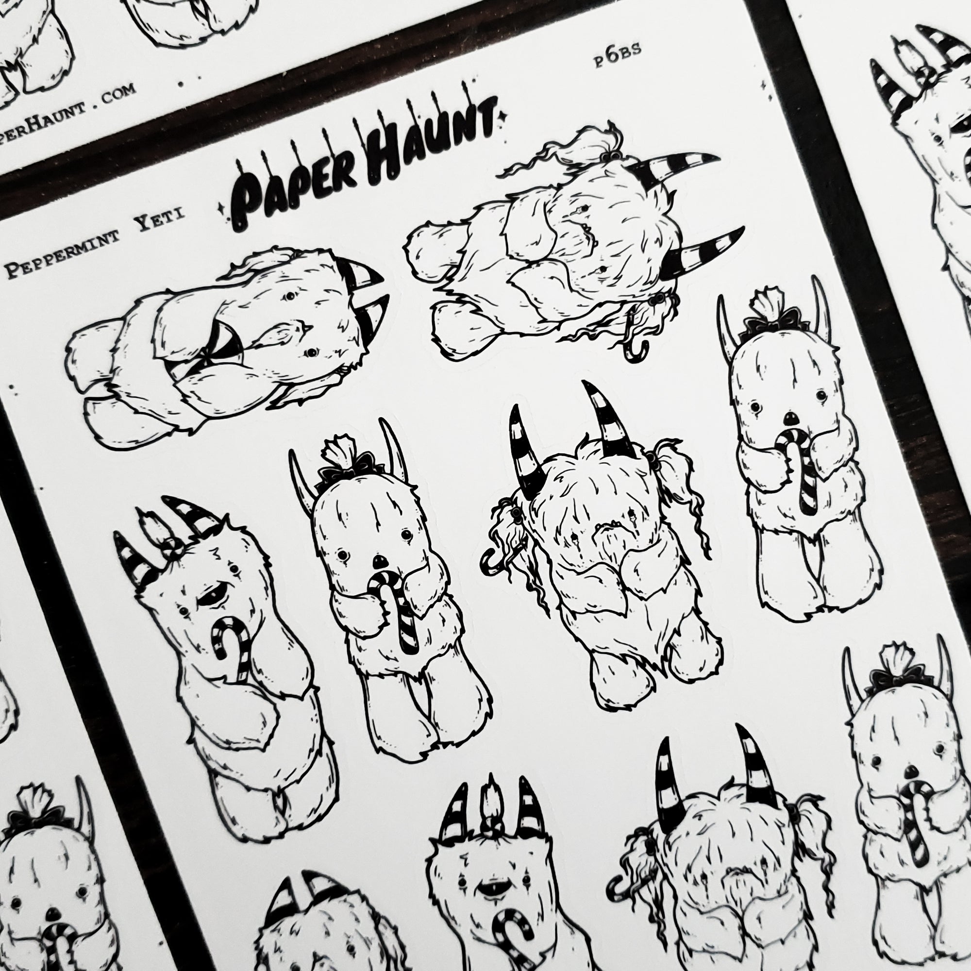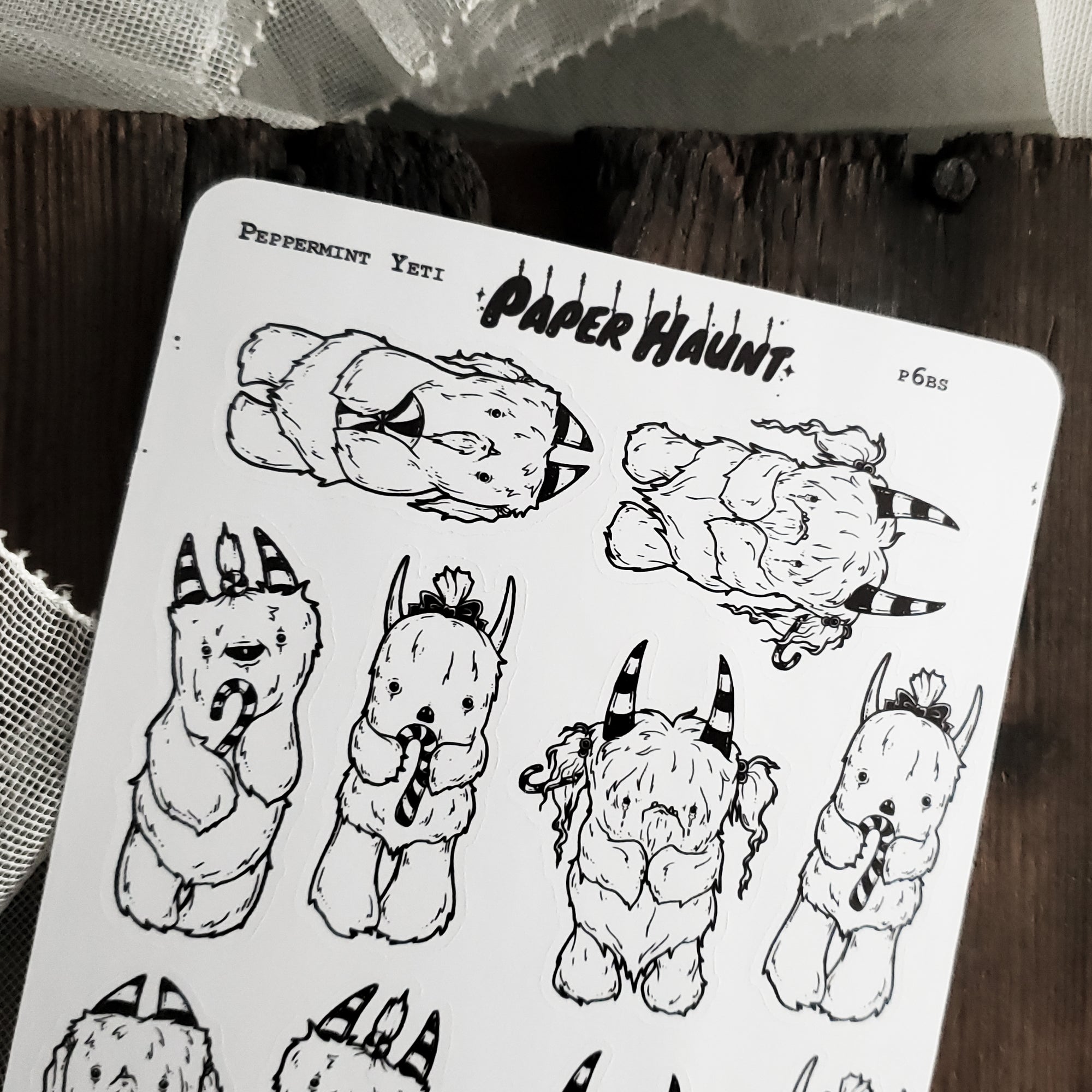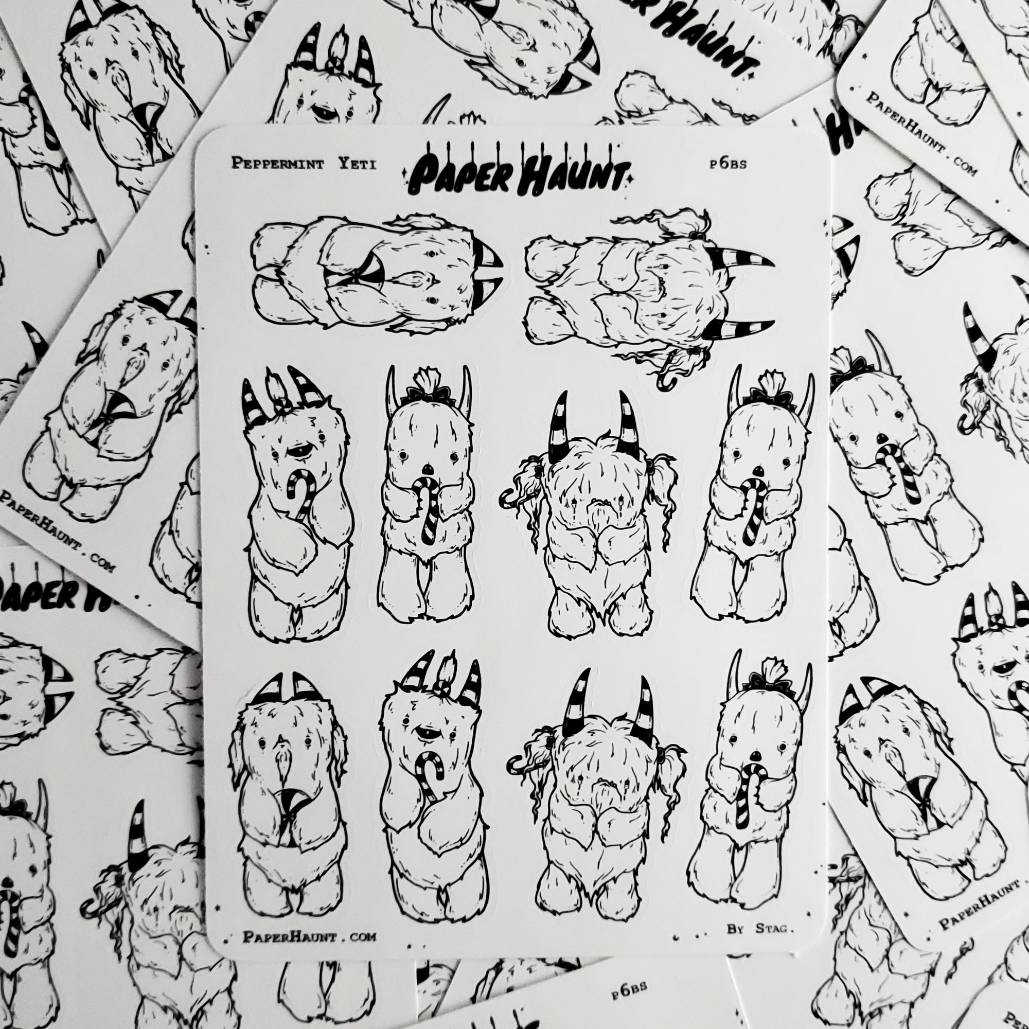 This set of creepy cute peppermint yeti monster planner stickers feature the art of White Stag. Festive cute adornments to haunt your journal, sketchbook or planner with a little seasonal cheer. This sheet of stickers includes 10 stickers, Perfect for journaling. These handcrafted planner stickers have a smooth buttery matte finish.