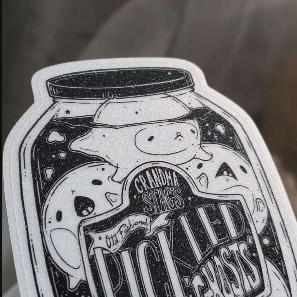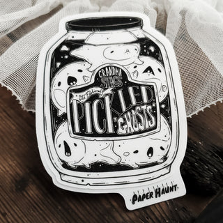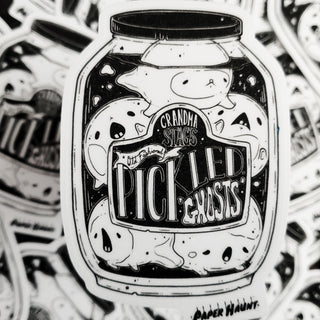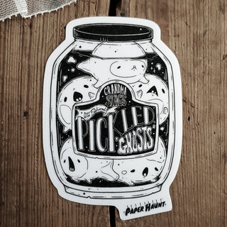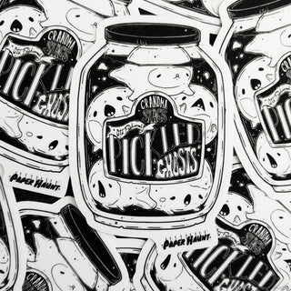 Pickled Ghosts, just like Grandma made. Haunt your laptop, journal or crypt with this haunting Pickled Ghost Sticker in black and white. Sticker design is part of the Ghost Foods Collection by Artist, White Stag.