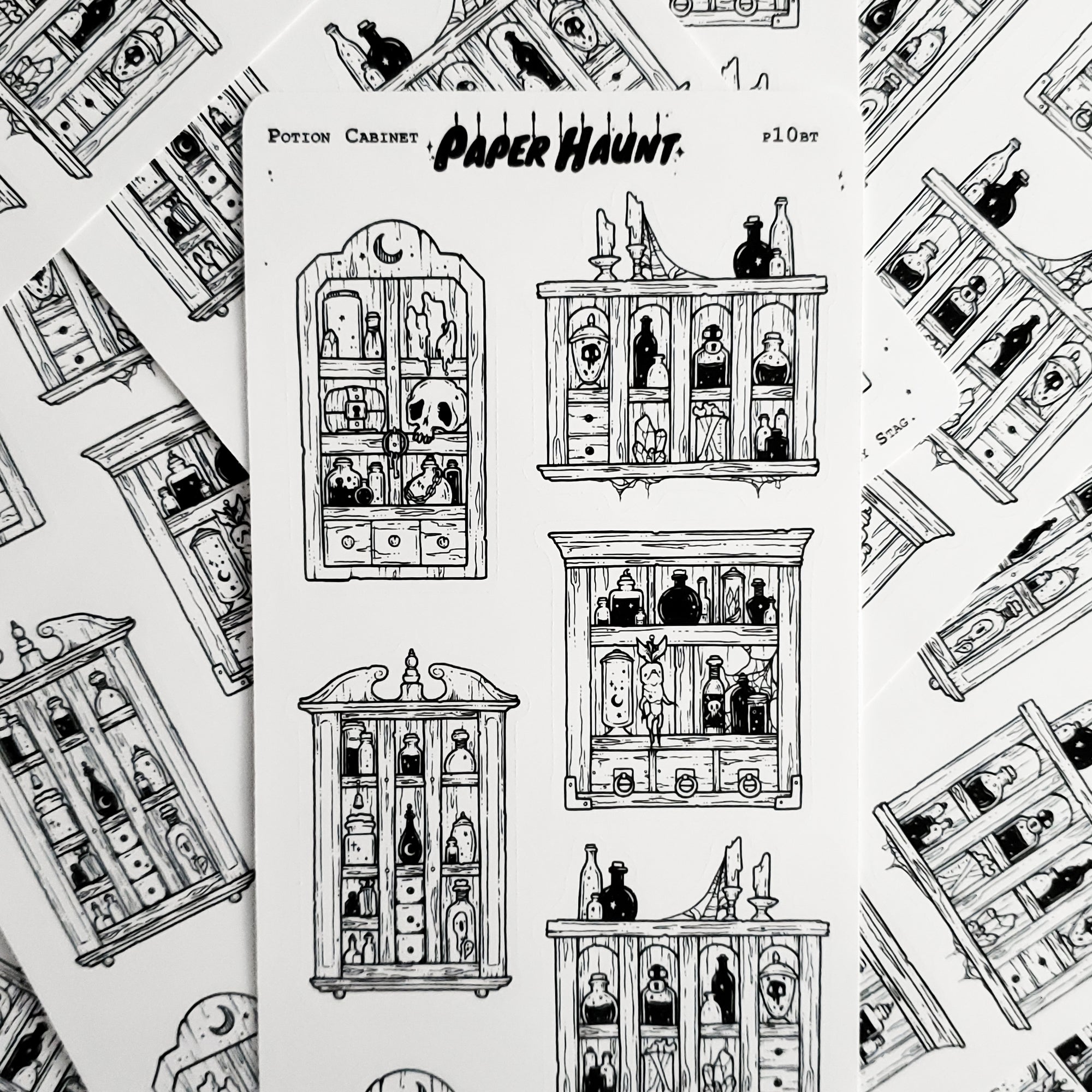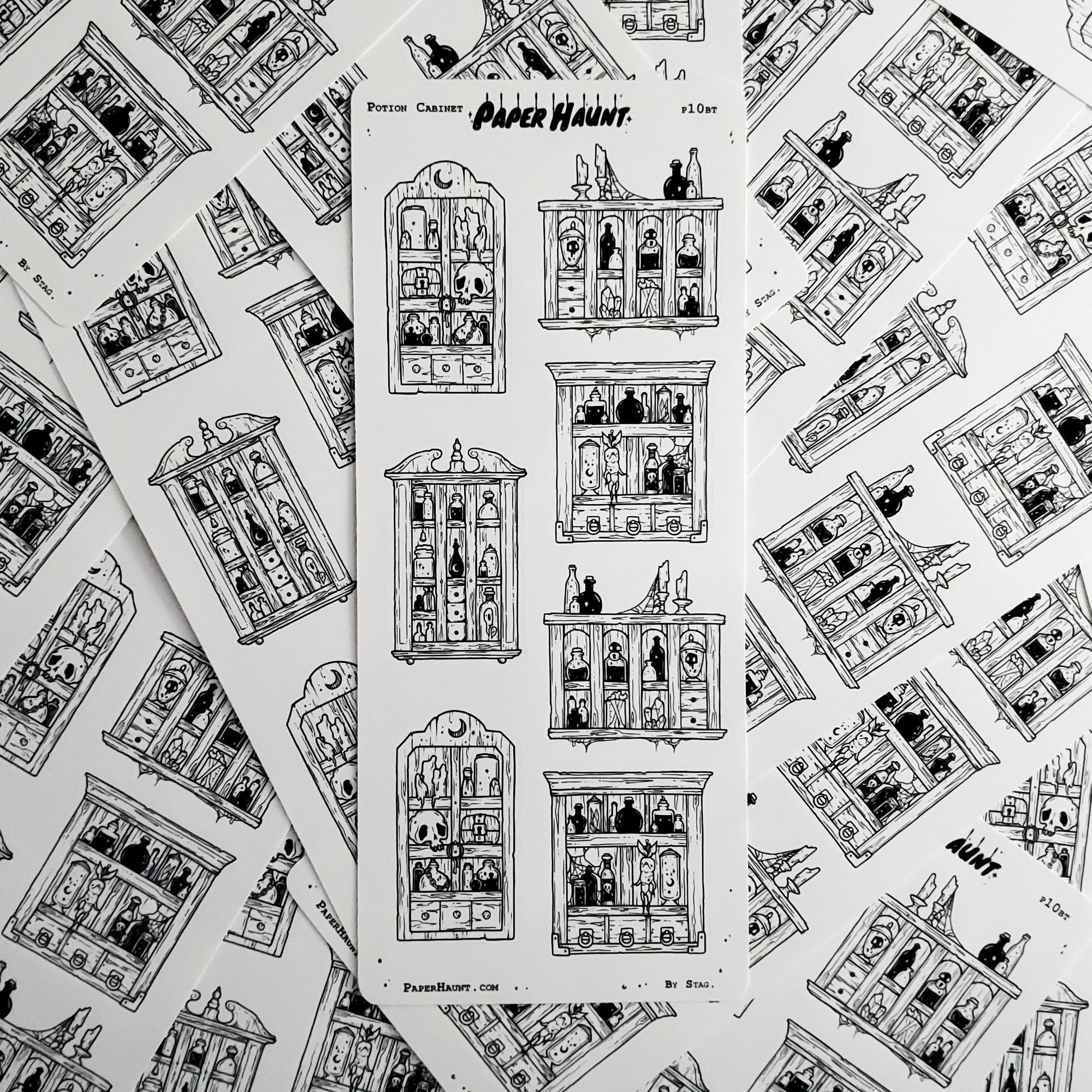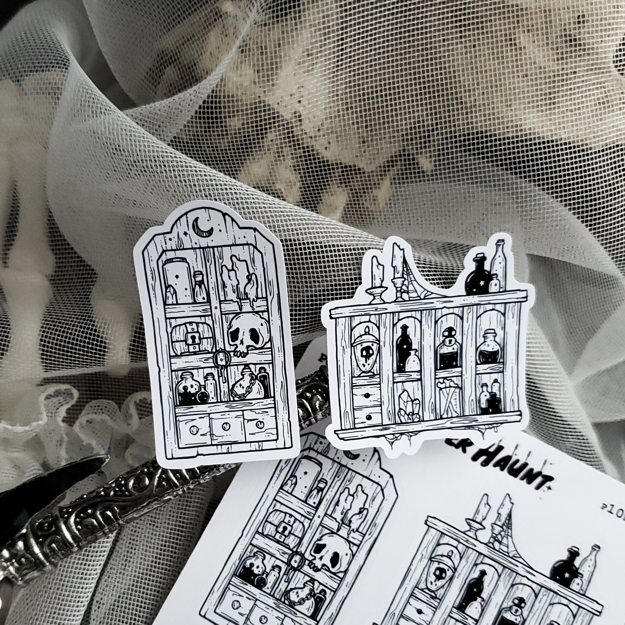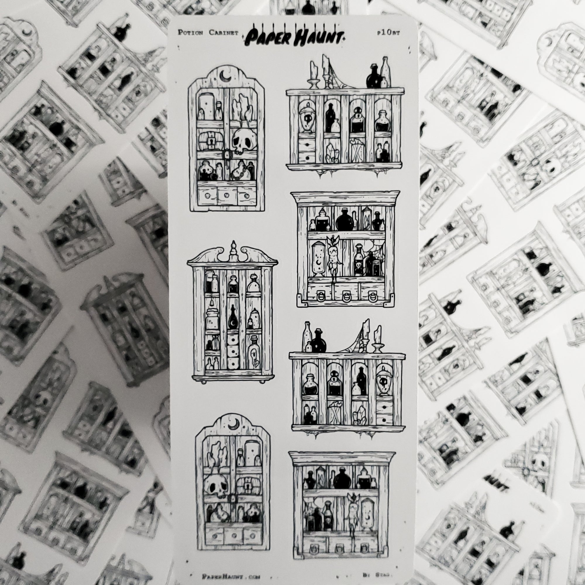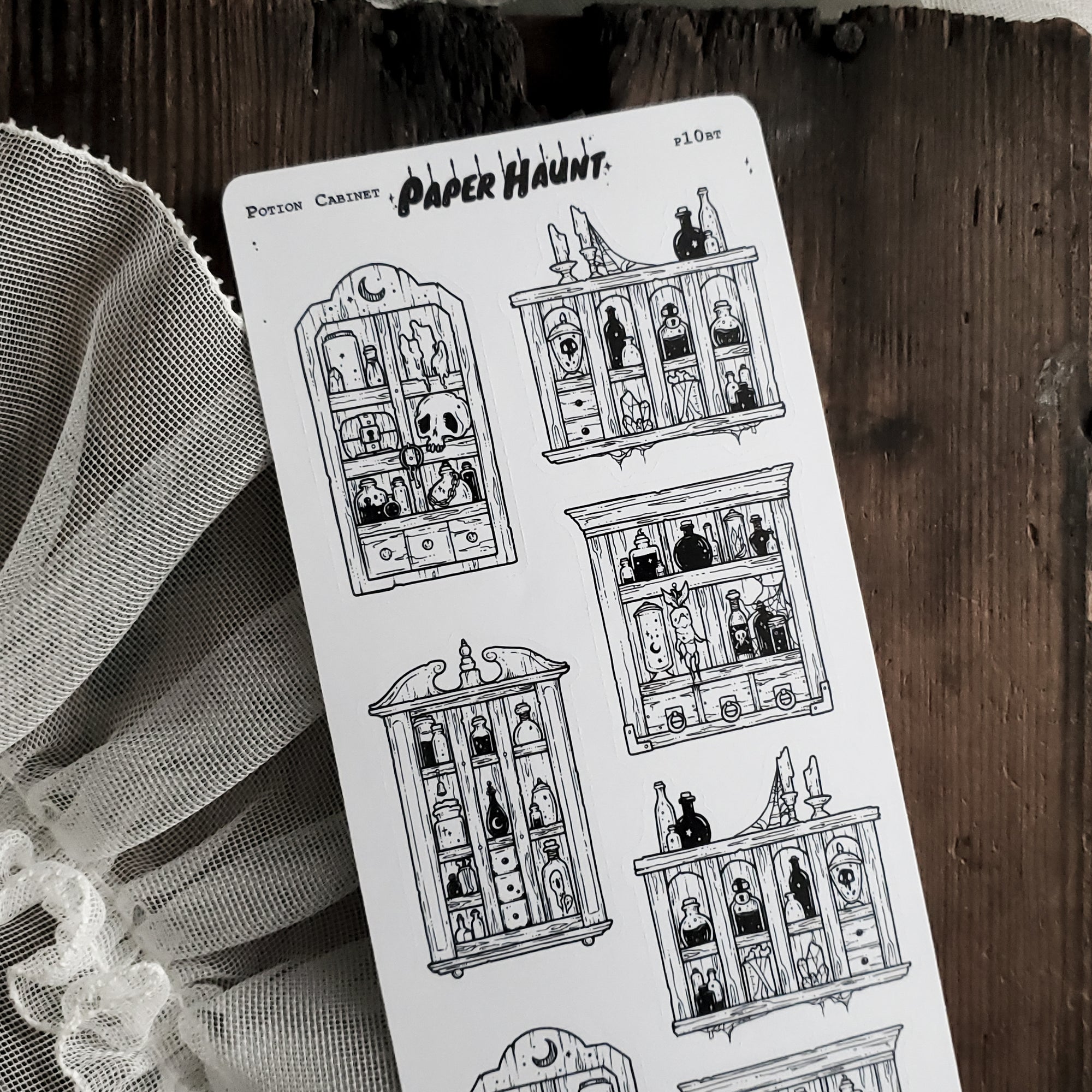 The Witch's shelf; A collective of poisons, potions, and curios. Sticker sheet featuring a collection of potions and witchy possessions on shelves. Enchanting adornments to haunt your journal, sketchbook or planner.