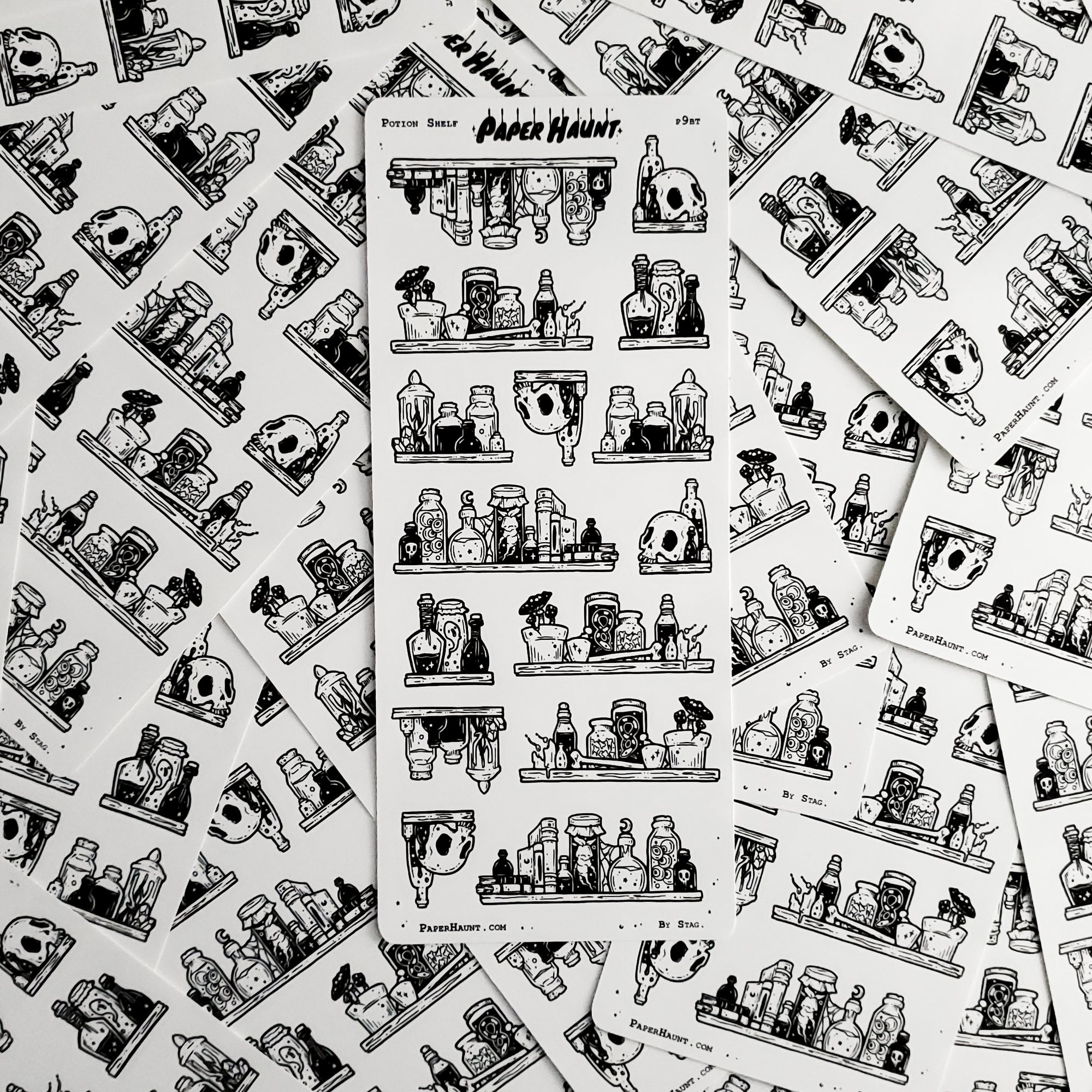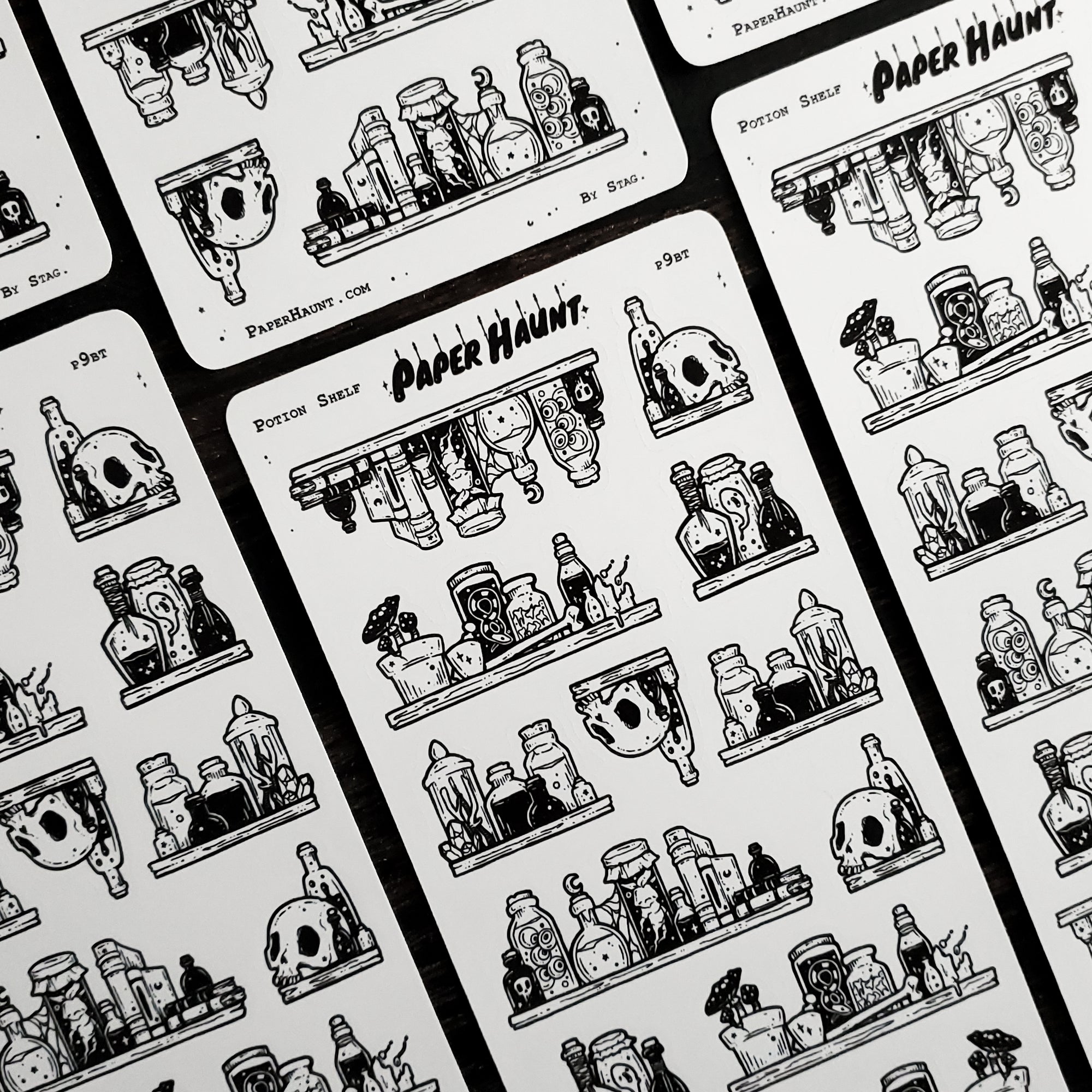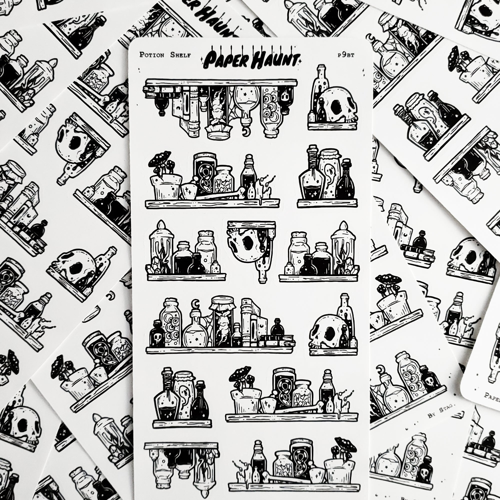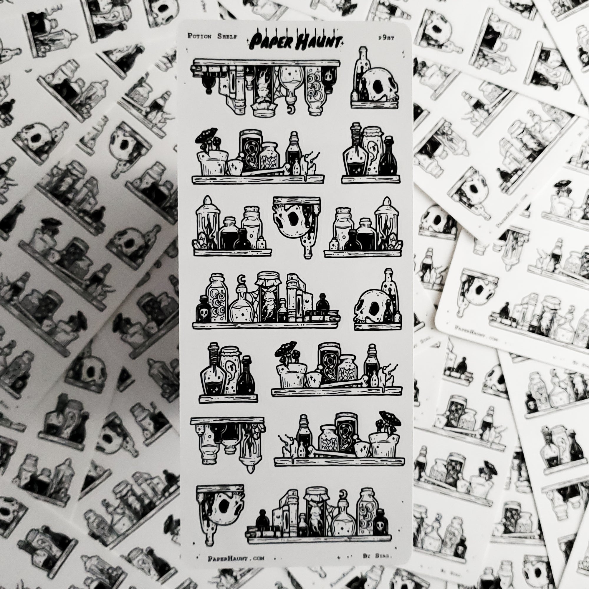 The Witch's shelf; A collective of poisons, potions, and curios. Sticker sheet featuring a collection of potions and witchy possessions on shelves. Enchanting adornments to haunt your journal, sketchbook or planner.