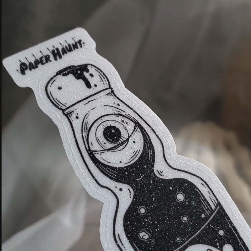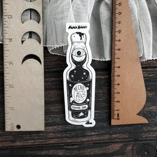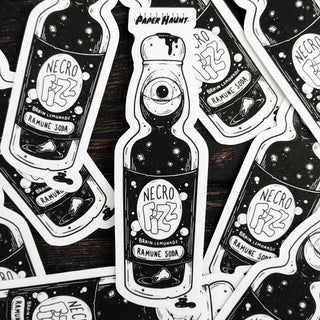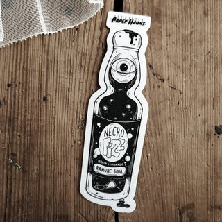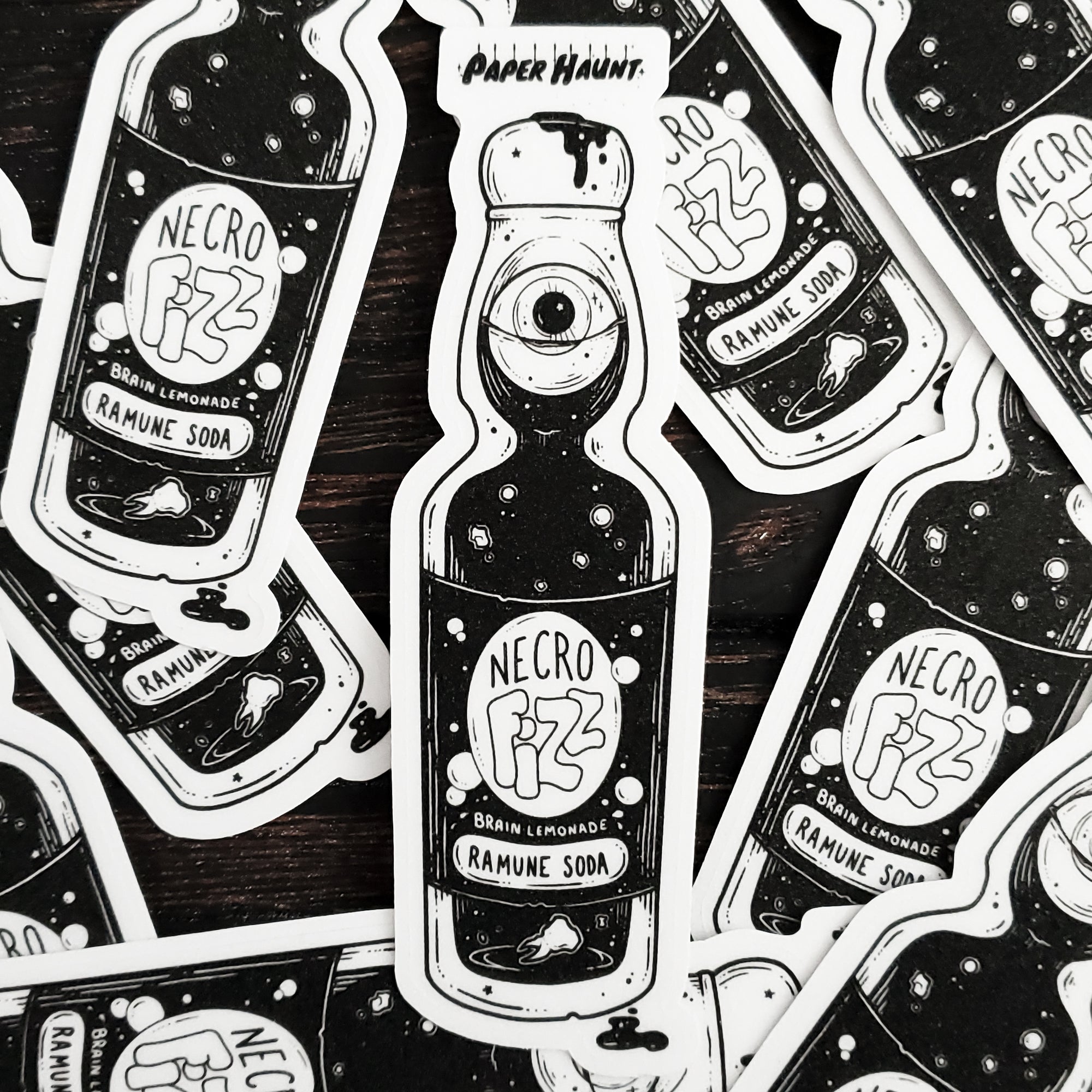 Haunt your laptop, journal or crypt with Zombie themed ramune soda spooky cute goth sticker in black and white. Creepy and kooky, this sticker features a a bottle of ramune soda with an eyeball marble now with bonus tooth.