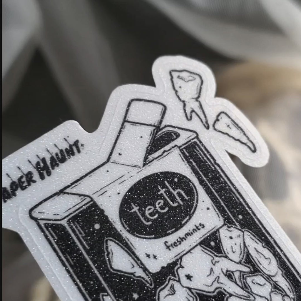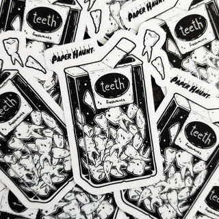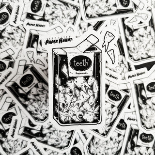 TEEF A Delightful crunch in every bite! Haunt your laptop, journal or crypt with TEETH sticker in black and white. Sticker is part of the zombie foods collection by Artist White stag.