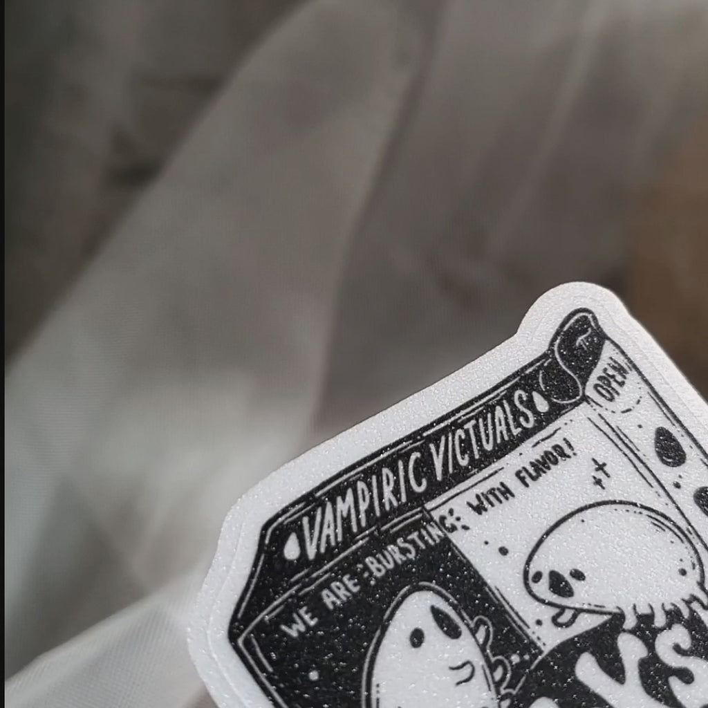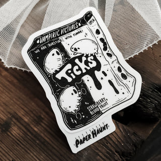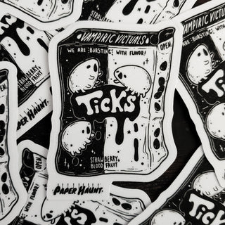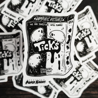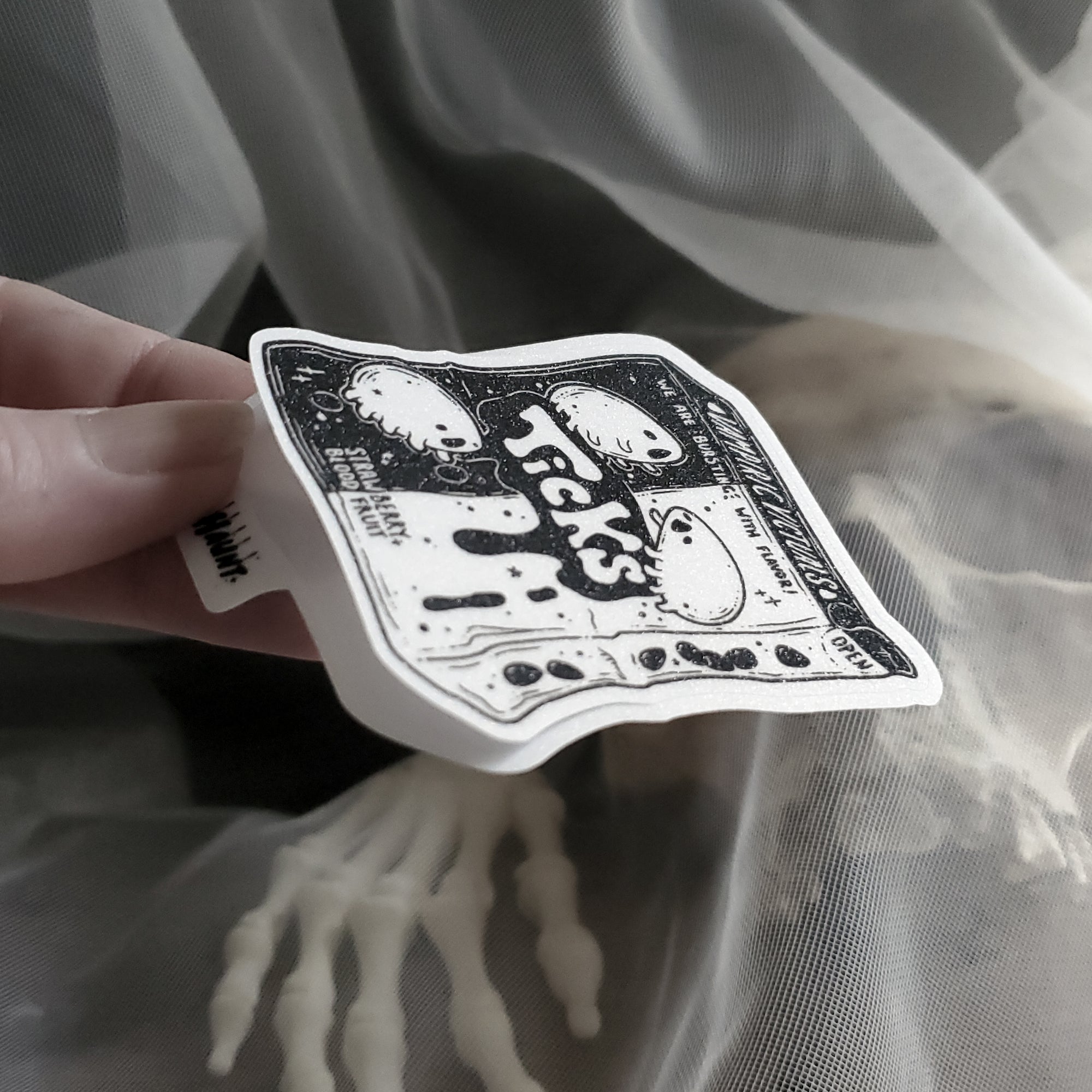 Vampire Candy sticker. Haunt your laptop, journal or crypt with this spooky cute vampire food sticker in black and white. Sticker features a tick vampire themed candy exploding with a pop of flavor. Creepy cute pastel goth adornment with an easy peel backing, perfect gift for Halloween and vampire. Logo is not part of sticker but the backing.