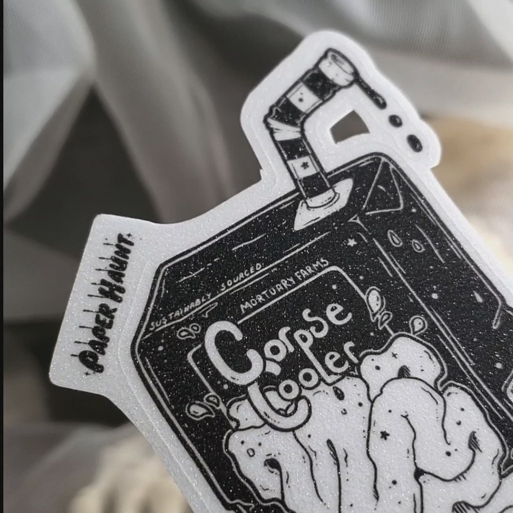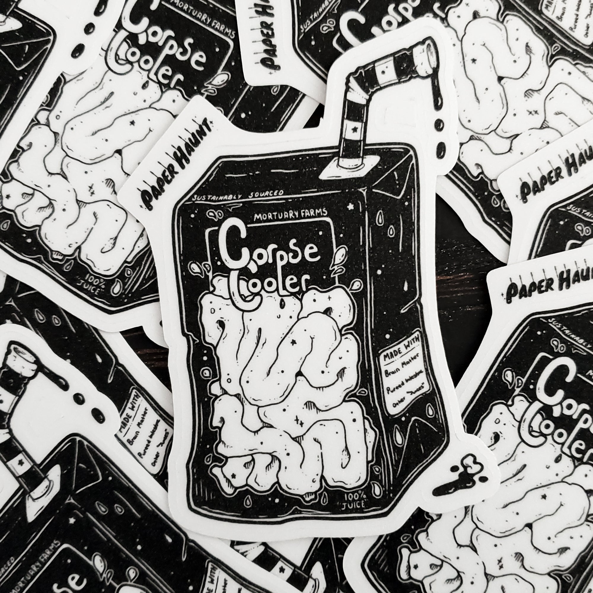 Haunt your laptop, journal or crypt with Corpse Cooler zombie Juice box sticker in black and white. Creepy cute sticker from the Zombie Foods collection by artist, White Stag.